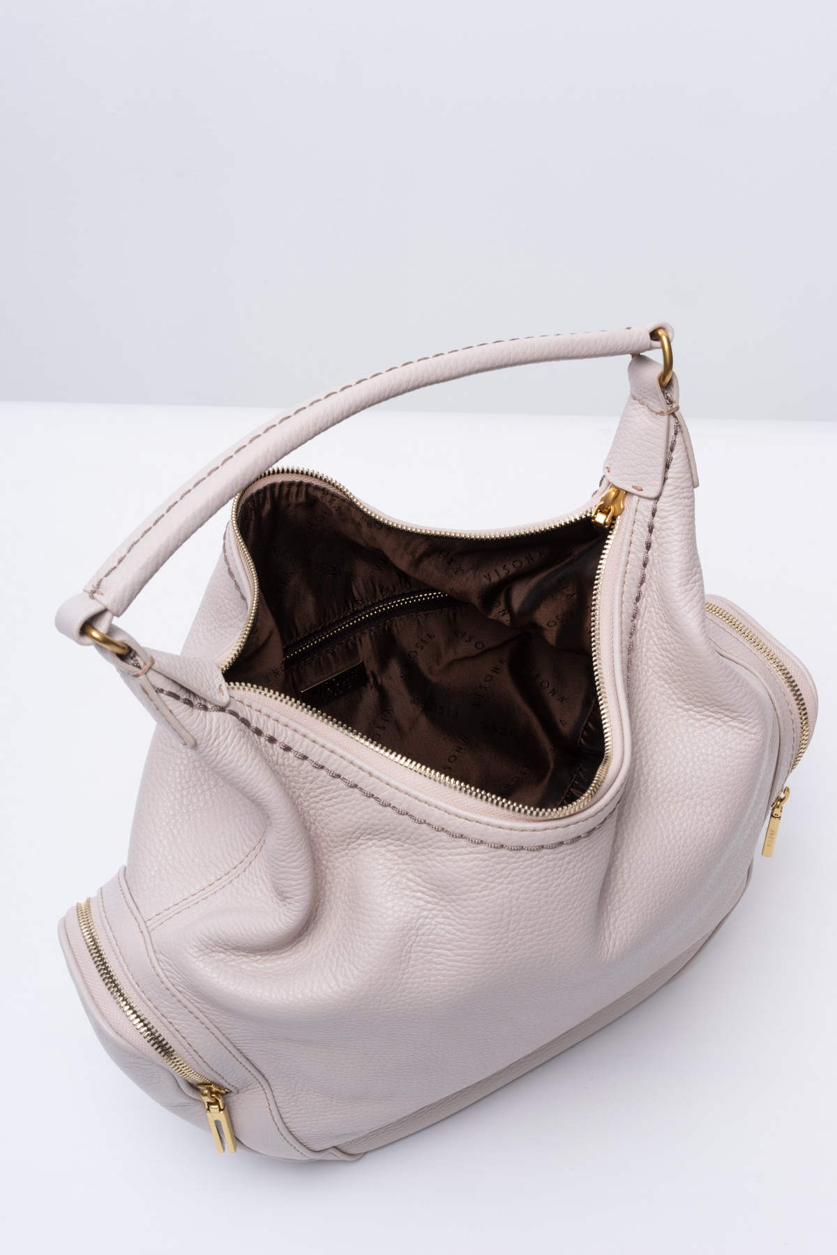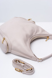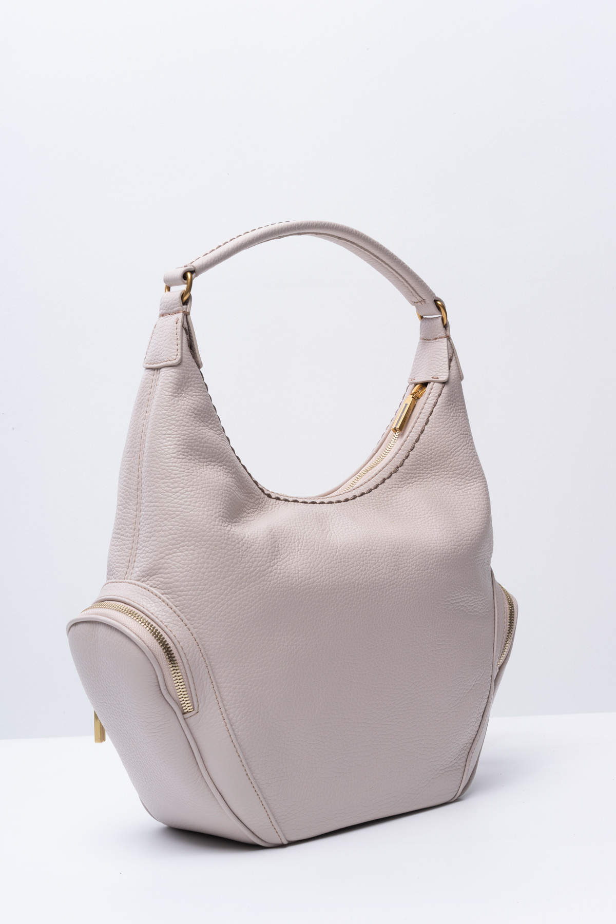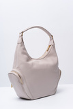 Натуральная жемчужно-серая кожа зернистой фактуры, фурнитура винтажного оттенка"античное золото" и авангардная форма создают стильную комбинацию, которая впишется в любой гардероб. Дополняет дизайн фирменная дымчатая прострочка. Хобо идеально ложится на плечо, а при желании его можно носить кросс-боди - длинный регулируемый ремешок в комплекте.