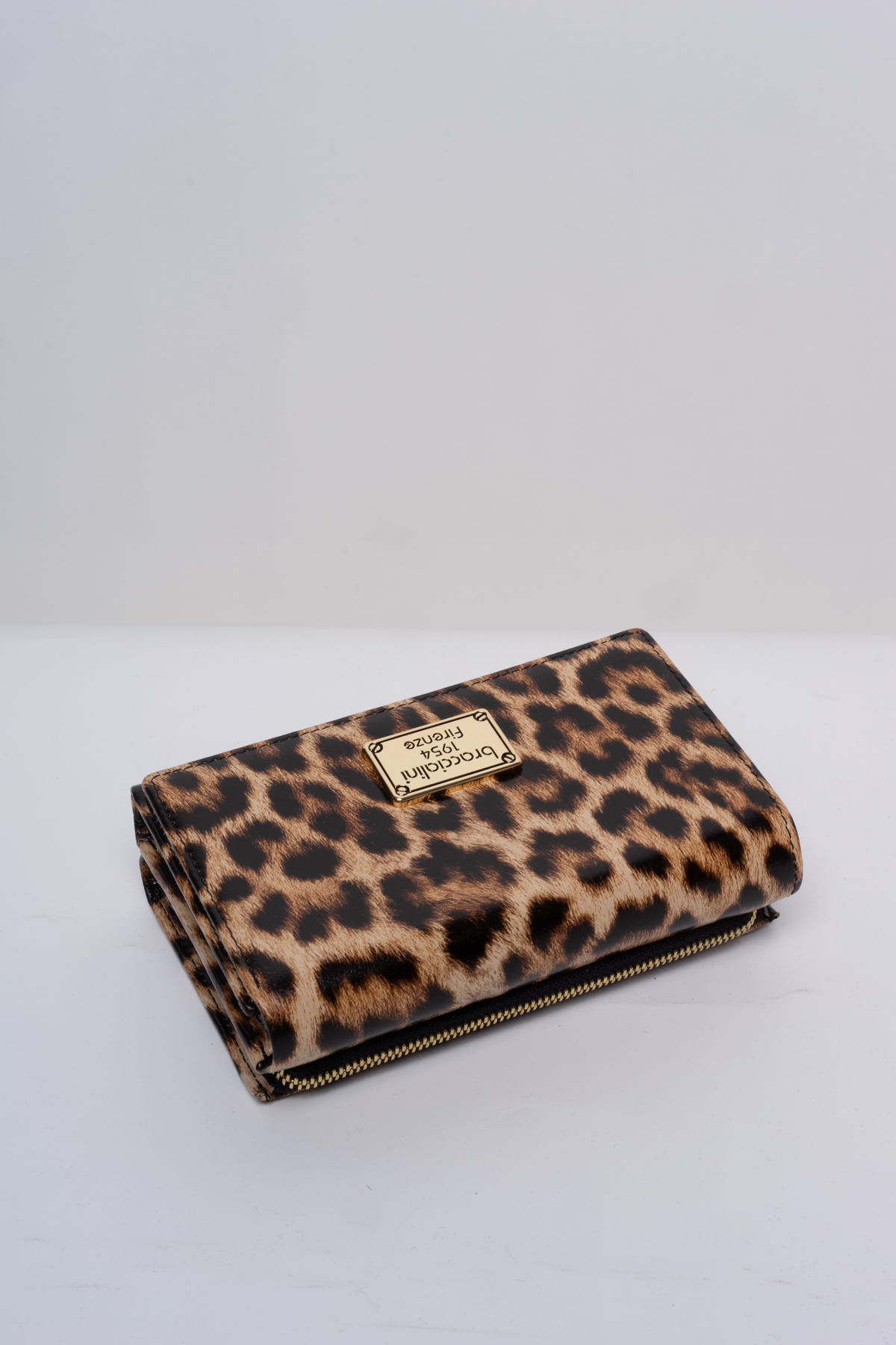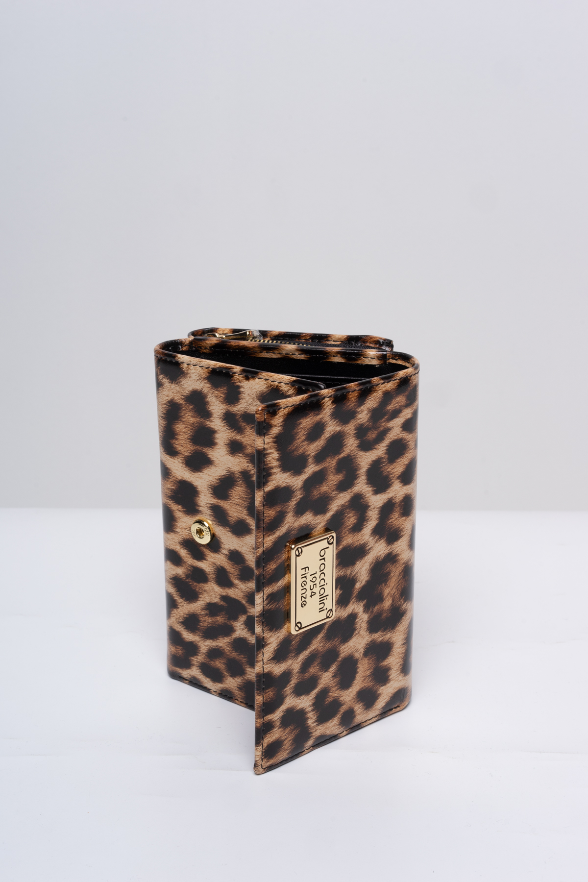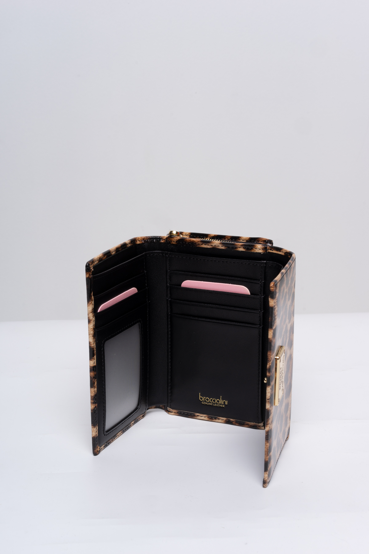 Стильный кошелек с безупречной организацией : есть отделение на молнии под мелочь и основное с отсеком под наличные деньги и двумя блоками по типу картхолдера . В качестве материала использовали плотную гладкую натуральную кожу в акцентном принте "лео".