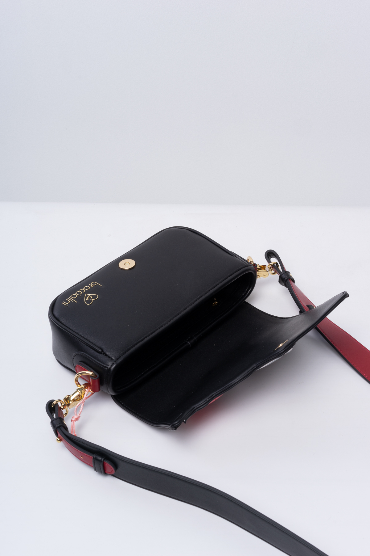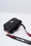 Аксессуар выполнен из технологичной гладкой экокожи черного цвета с деликатным блеском. Застежка на клапан с автоматической кнопкой, внутри отделение на подкладке и два кармашка для мелочей. Широкий ремешок окрашен с внутренней стороны в благородный винный цвет.