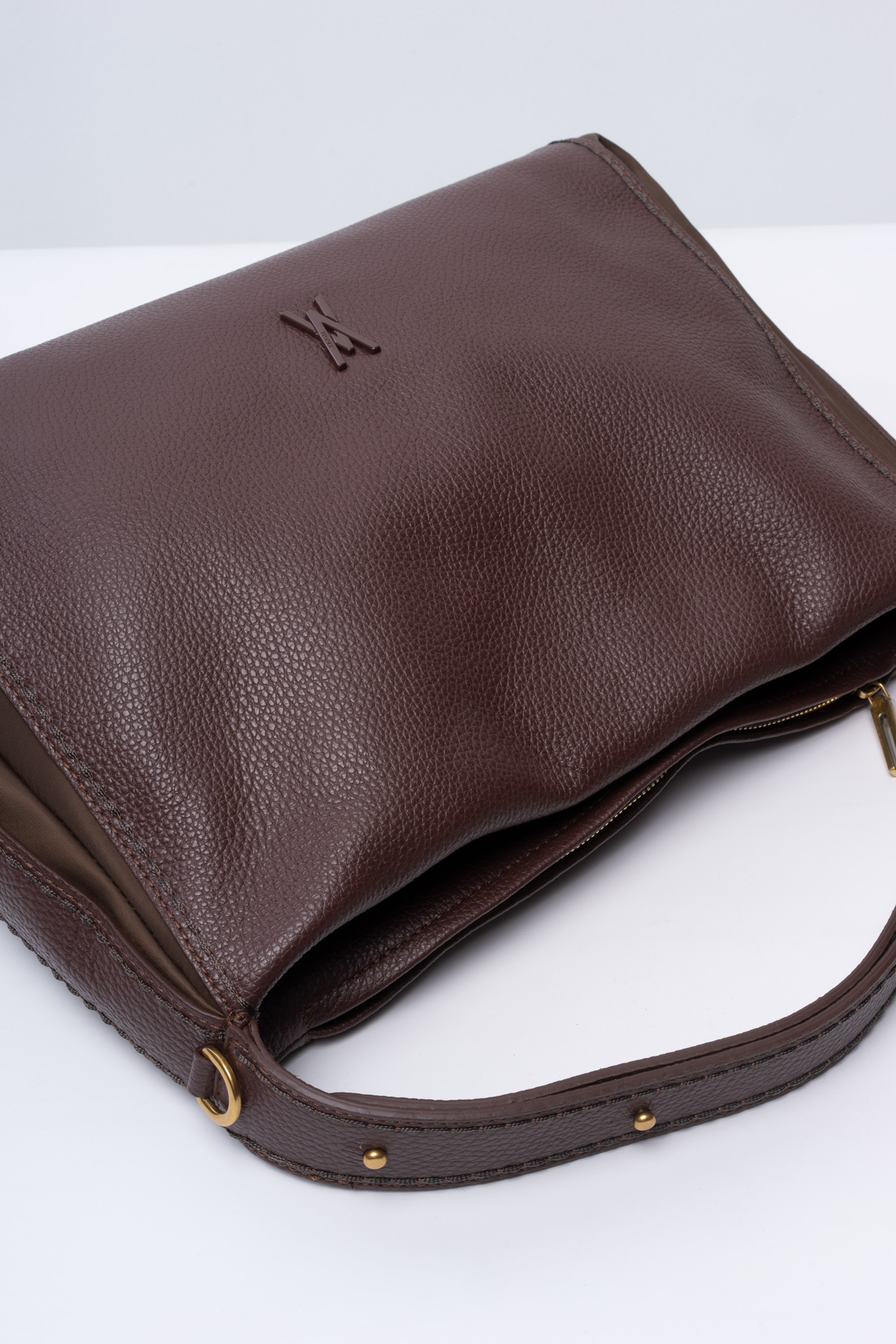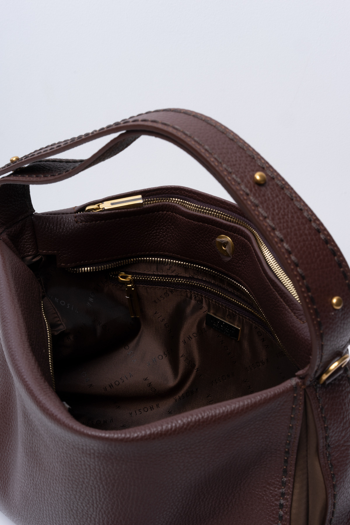 Мягчайшее шоколадное хобо VISONA' из натуральной зернистой кожи - элегантный спутник на осенне-зимний сезон. Очень вместительный объем и безупречная организация, которая позволит держать содержимое в полном порядке: два отделения под молнией на подкладке и кармашки под мелочи. Боковые части дополнены высокотехнологичным нейлоном, фурнитура винтажного оттенка "античное золото" эффектно сочетается с цветом шоколада, а лаконичный логотип ненавязчиво подчеркивает стиль бренда. Плечевая ручка регулируется по длине, при желании можно носить аксессуар кросс-боди - ремешок регулируется по длине.