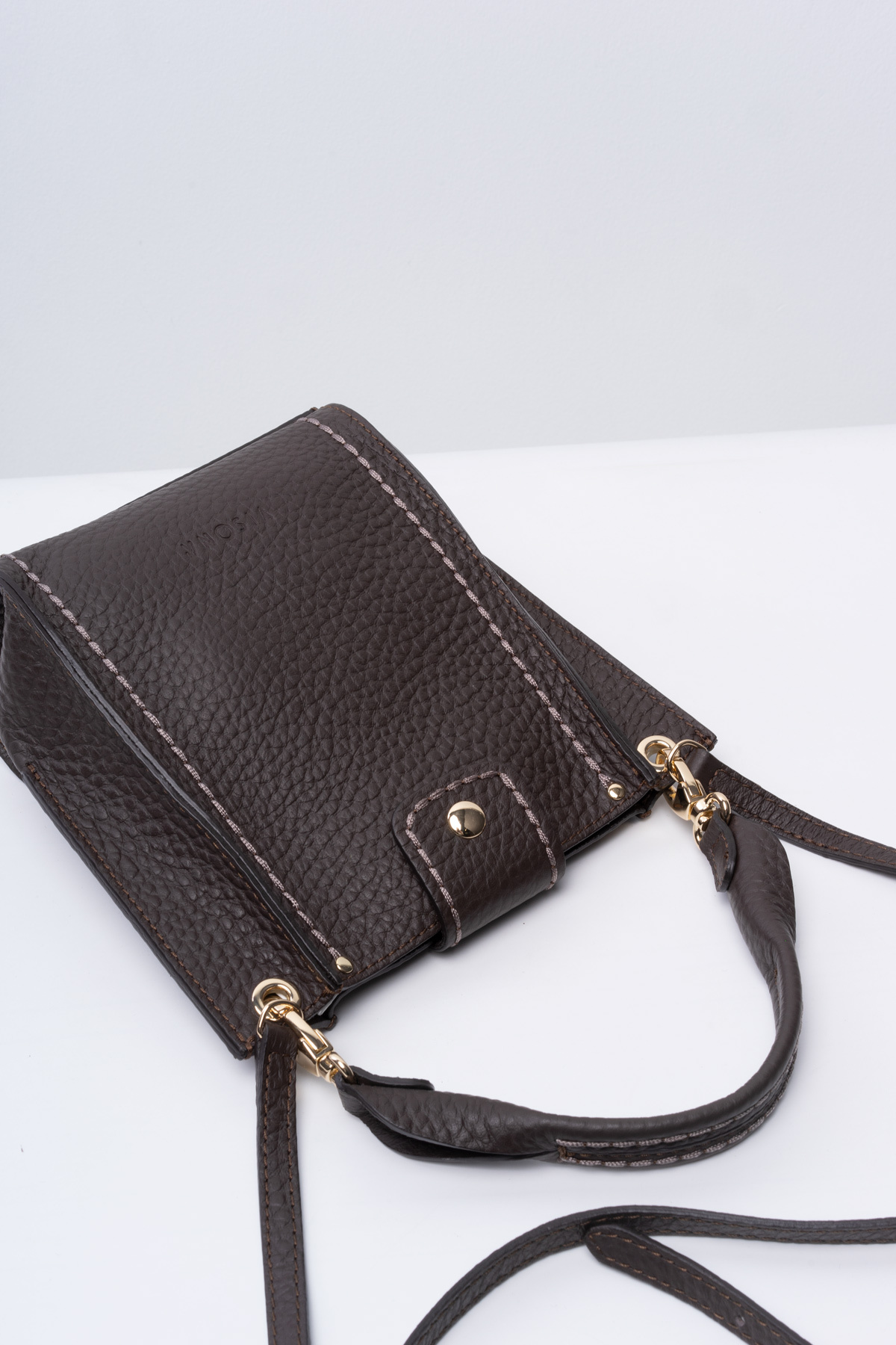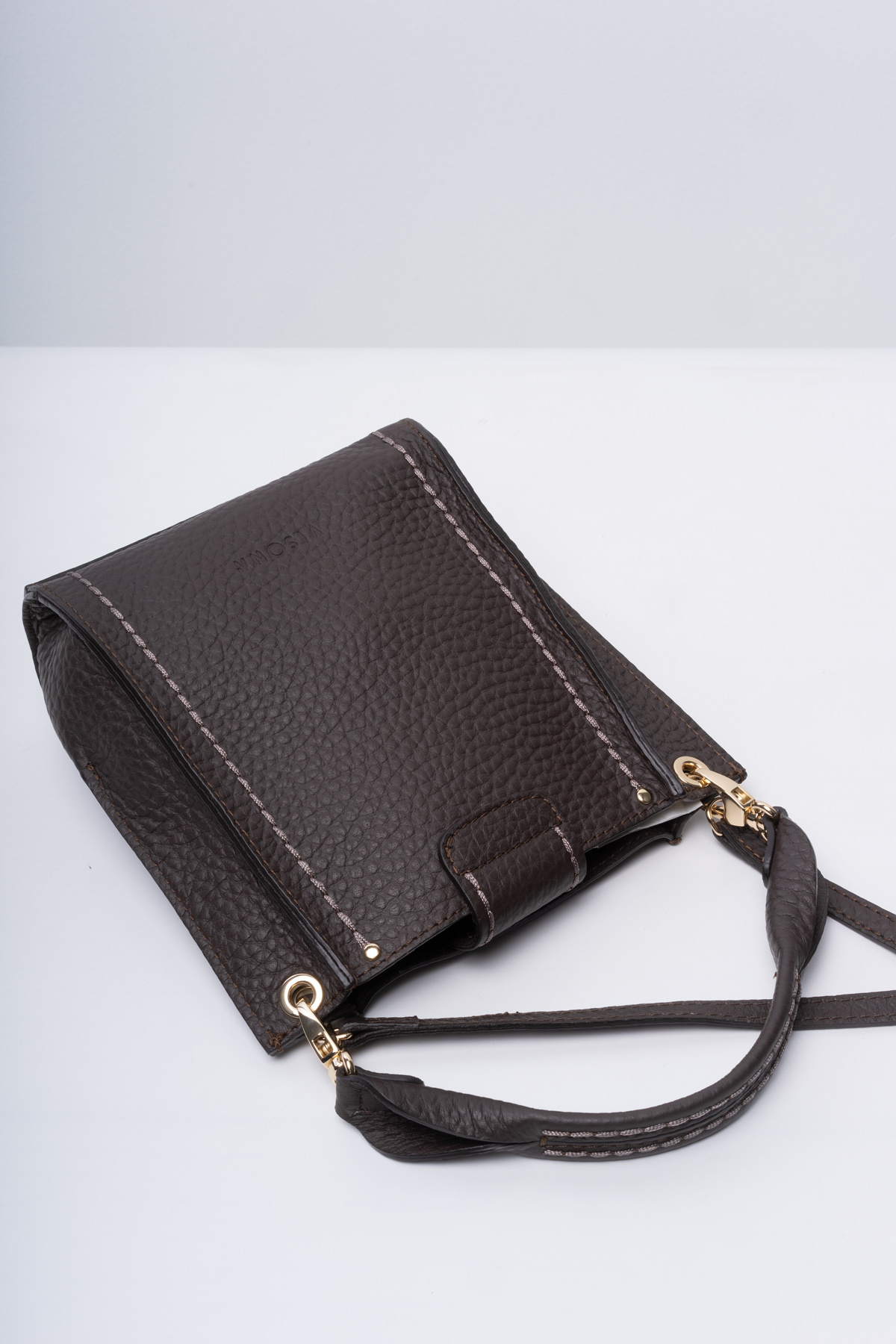 Миниатюрная кросс-боди VISONA', в которую поместится все самое необходимое. Мягкая гранулированная натуральная кожа исполнена в богатом шоколадном цвете, с которым контрастирует дымчатая строчка и фурнитура "светлое золото".