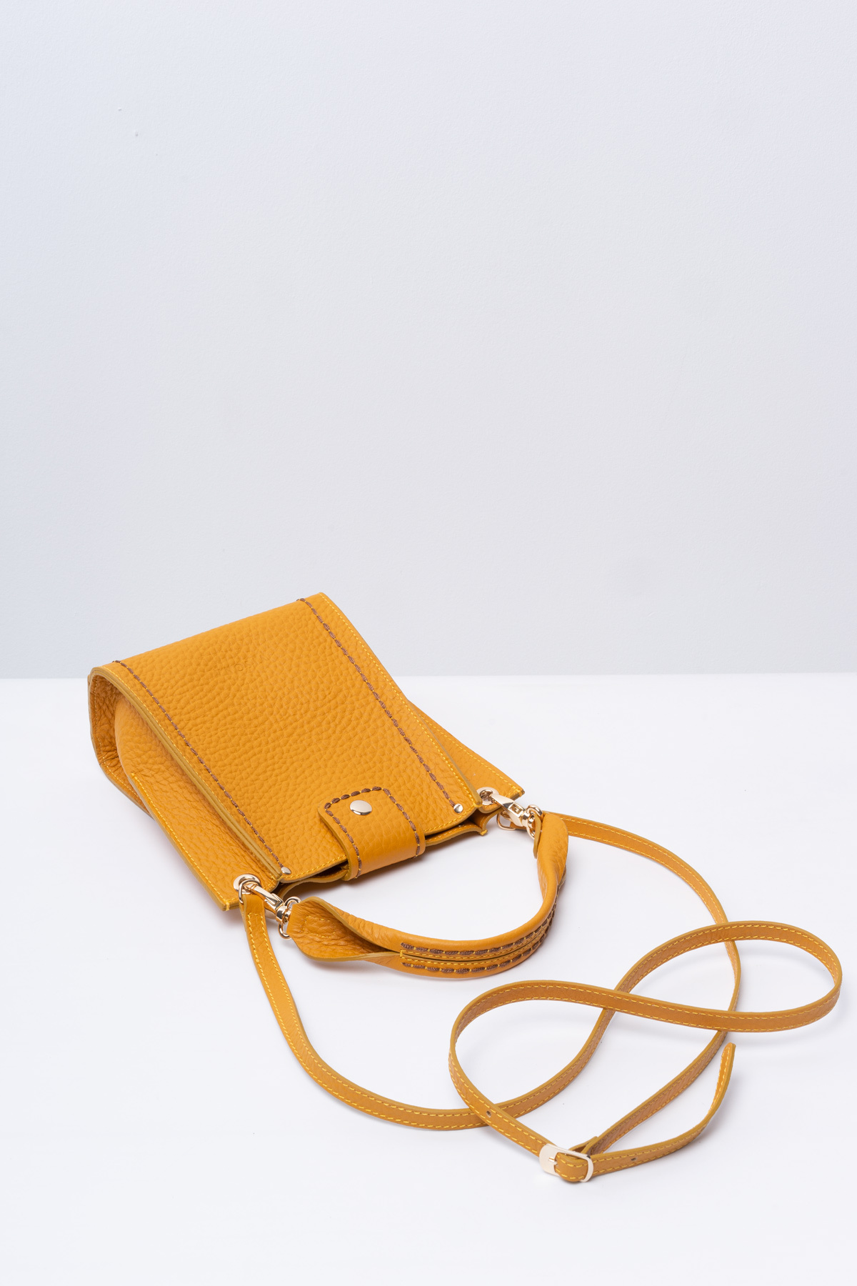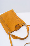 Миниатюрная кросс-боди VISONA', в которую поместится все самое необходимое. Мягкую гранулированную натуральную кожу эффектного шафранового цвета контрастно подчеркивает шоколадная прострочка и светло-золотая фурнитура.
