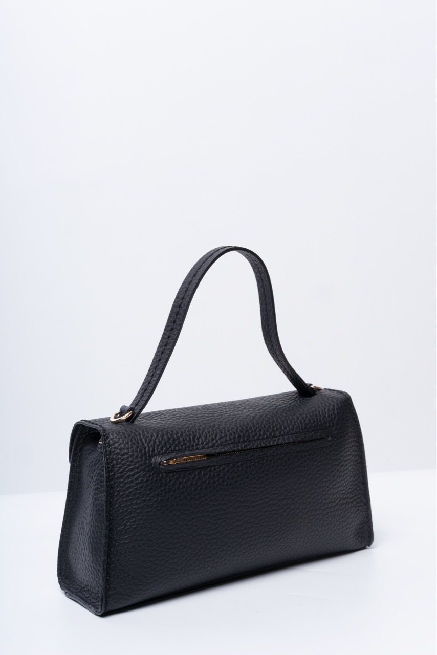 Минималистичный портфель среднего формата - это незаменимый элемент гардероба. Глубокий черный цвет подчеркивает крупнозернистую фактуру натуральной кожи, дизайн завершает изящный логотип бренда в центре. Чёткая, собранная линейная форма вносит в образ характер, а мягкость кожи - живость и тактильное наслаждение. Именно поэтому портфель органично вписывается и в классический деловой гардероб, и в повседневные луки.