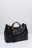 Большой черный шоппер - незаменимый формат в гардеробе любой женщины. Оптимальный объем, позволяющий вместить бумаги, ноутбук и даже одежду для зала, универсальный черный цвет, который впишется в большинство луков и удобство в ношении как на коротких ручках, так и на длинном широком ремешке.