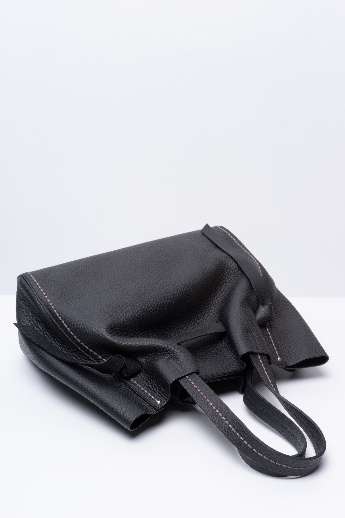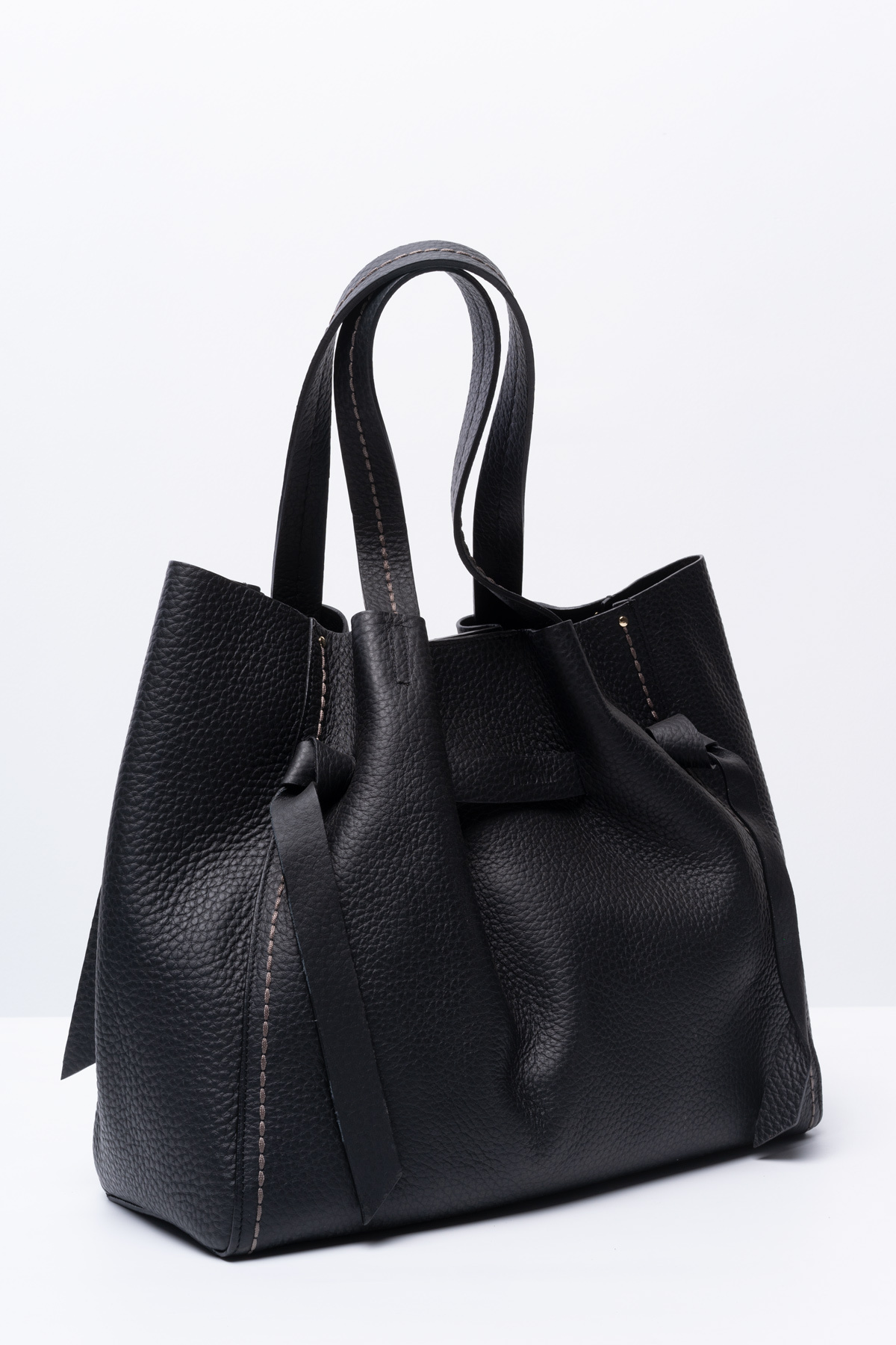 Объемный черный шоппер VISONA' идеально дополнит осенние и зимние образы. Особый шарм добавляют изящные узелки и легкая драпировка, а дымчатая прострочка подчеркивает фирменный стиль VISONA'. Основное отделение надежно застегивается на молнию, а по бокам два отсека быстрого доступа. Отборная натуральная кожа крупнозернистой фактуры, фурнитура "светлое золото".