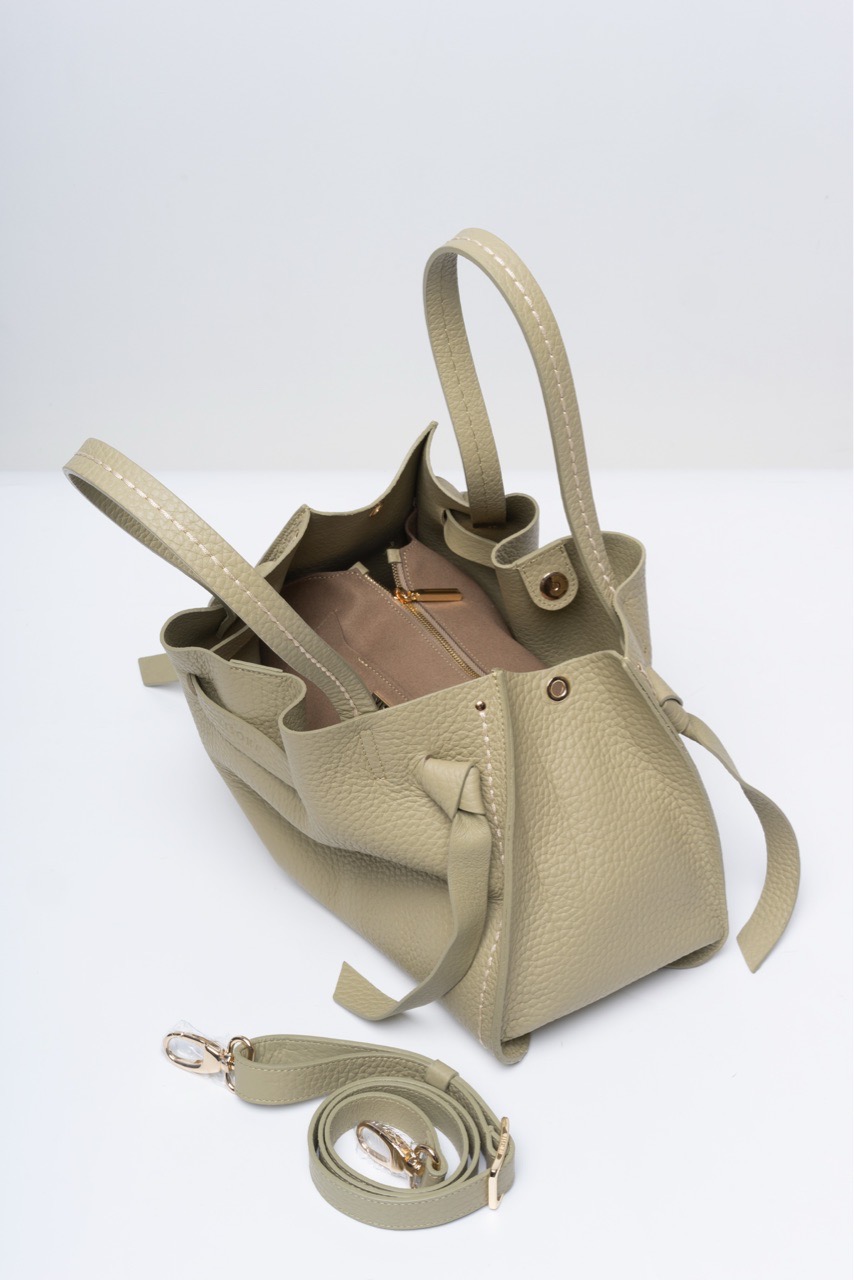 Аккуратные мягкие ручки и очаровательные завязки по бокам создают игривый и притягательный силуэт с драпировкой, деликатно подчеркнутый светлой прострочкой. Внутри порядок и комфорт: под магнитной кнопкой вместительное основное отделение на молнии, по бокам отсеки быстрого доступа. В комплекте длинный регулируемый ремешок.