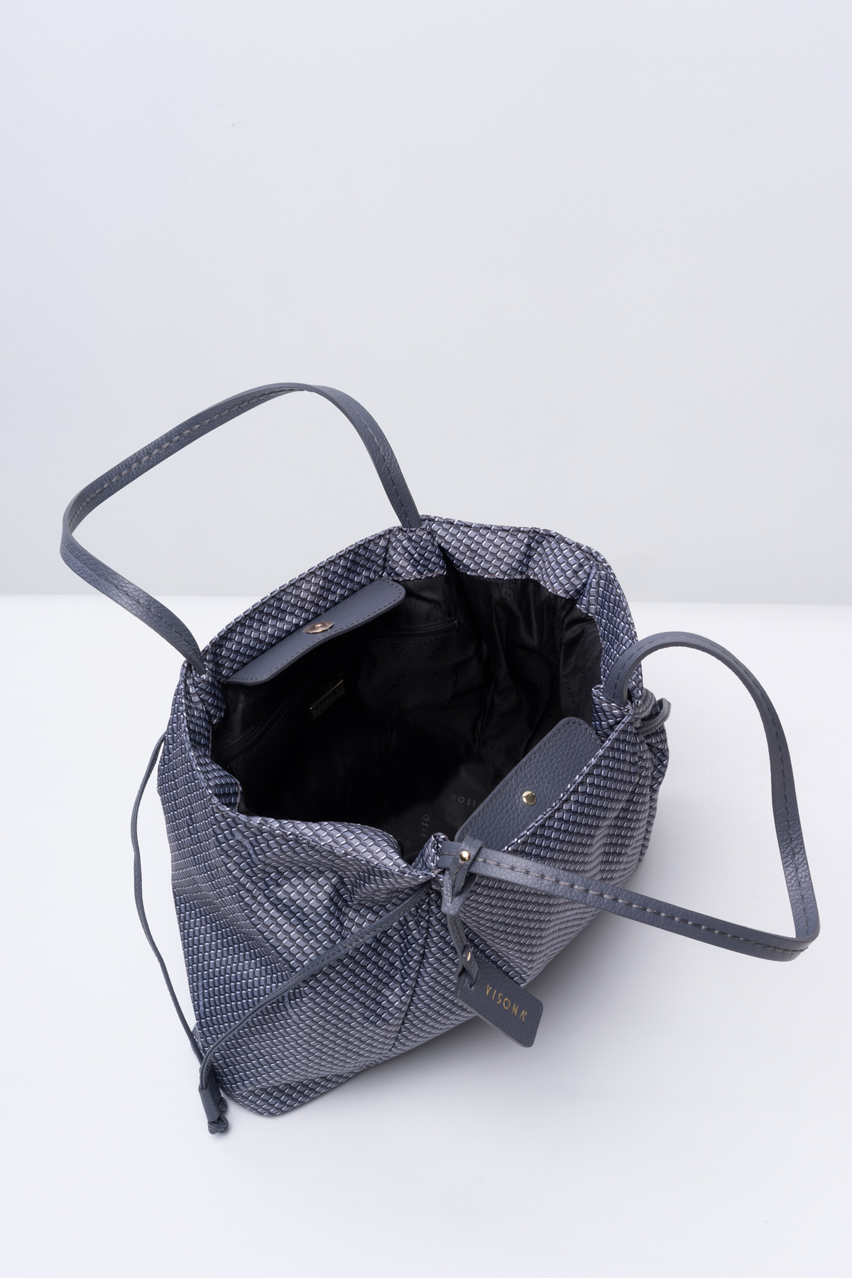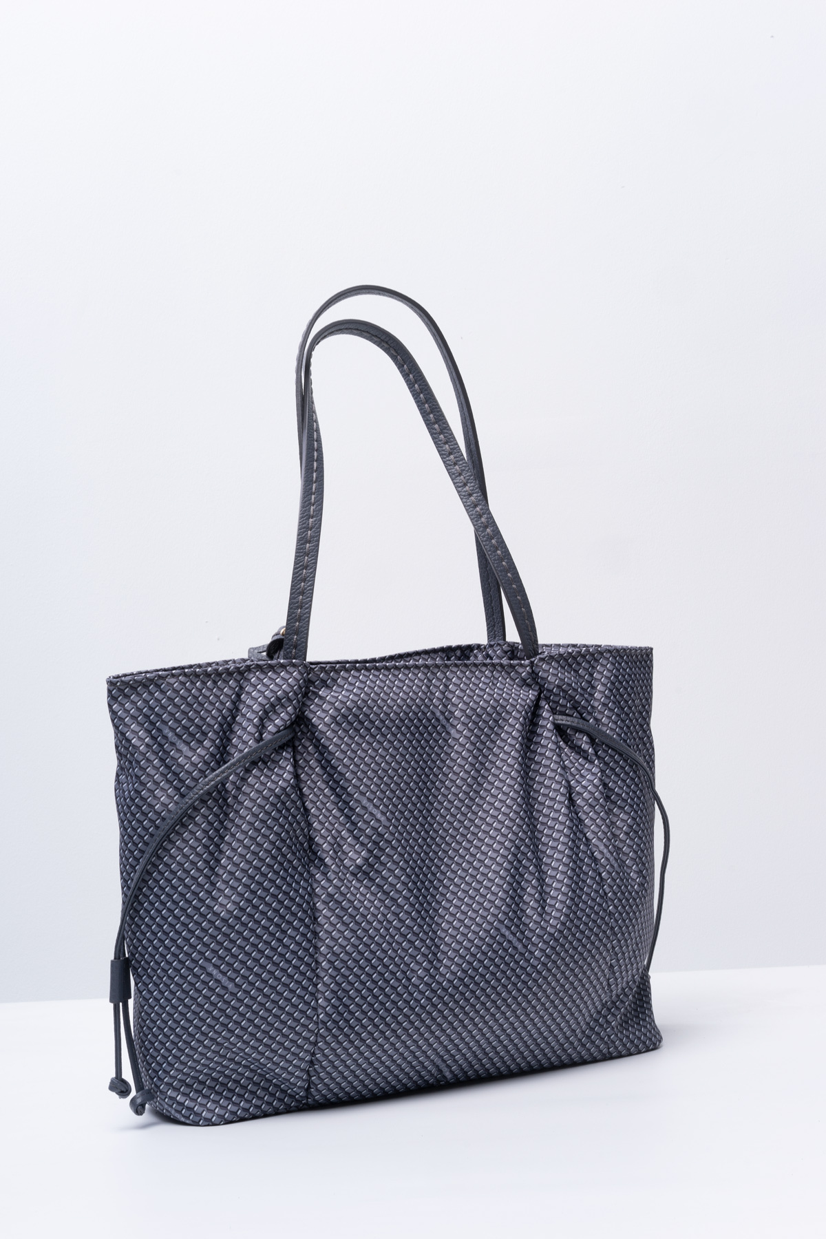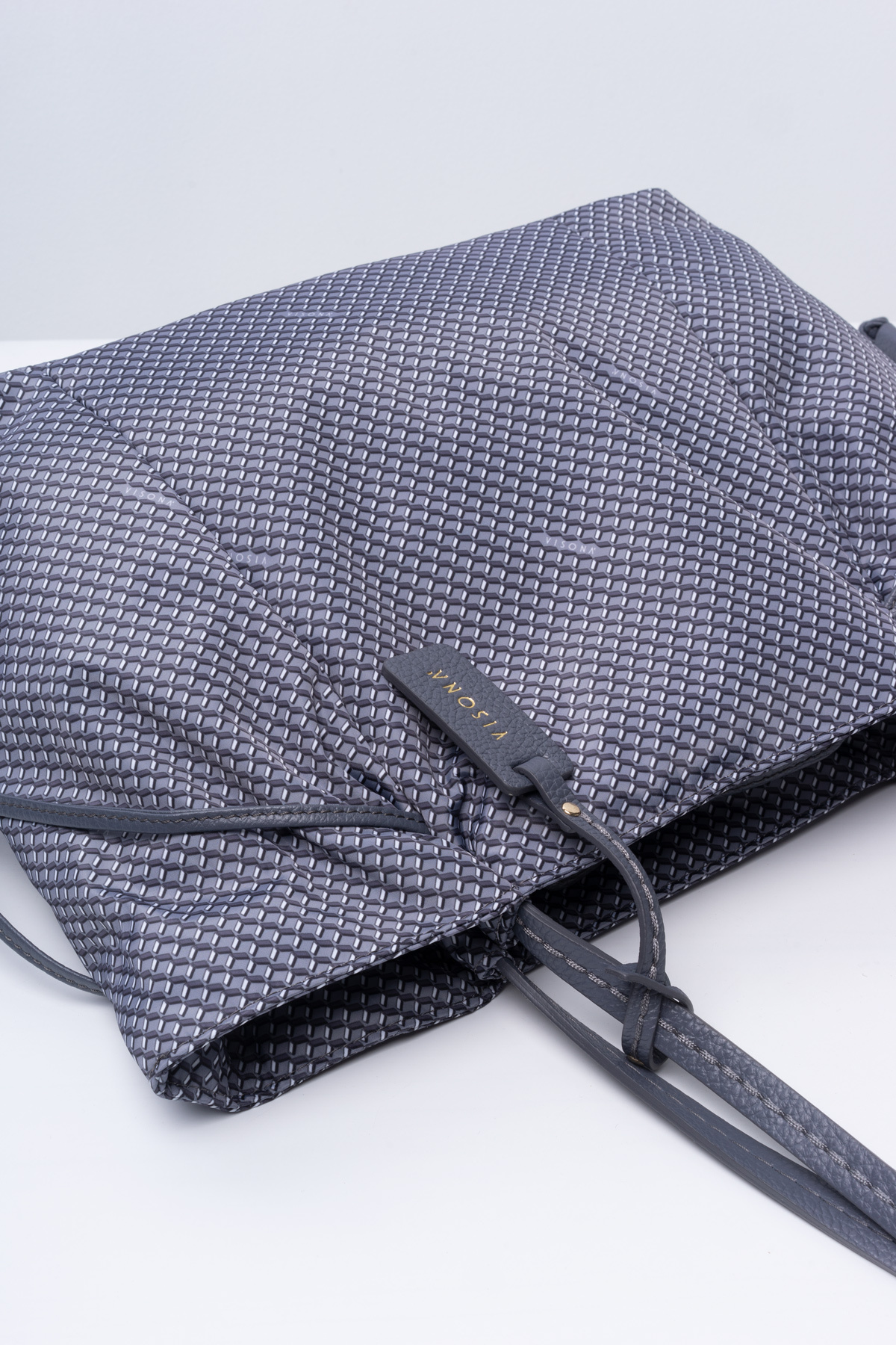 Мягкий шоппер VISONA' с традиционным брендовым принтом chantal выполнен в сочетании технологичного и непромокаемого нейлона и натуральной зернистой кожи. Уникальная расцветка содержит в себе пыльно-голубые, серые и белые оттенки, что позволяет органично вписать сумку в самые разнообразные образы, а вместительность и функциональность делают ее отличным вариантом на каждый день. Основное отделение закрывается на магнитную кнопку - для быстрого доступа, внутри снабжено подкладкой и кармашками для мелочей. Элегантный акцент создают лаконичный брелок с золотым тиснением логотипа и изящные затяжки по бокам, которыми можно сдрапировать сумку и уменьшить ее объем.