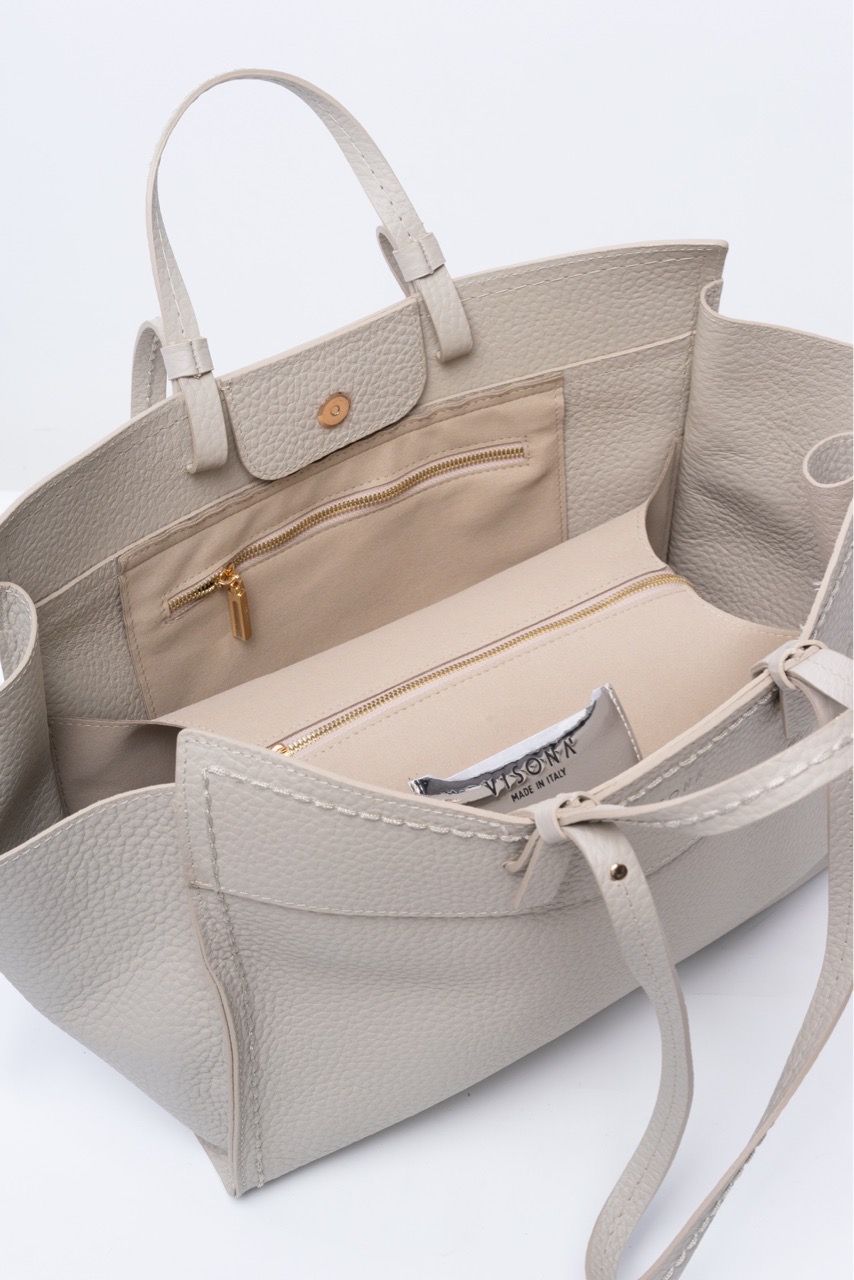Дизайнеры бренда VISONA’ создали сумку с утонченным силуэтом, навеянным формой изящной ладьи. Оригинальную архитектуру подчеркивает прострочка тон в тон. Льняной оттенок придает модели благородную мягкость и универсальность - он особенно дорого смотрится в крупнозернистой фактуре отборной натуральной кожи. Продуманная внутренняя организация включает основной отдел на молнии и два боковых отсека, обеспечивающие идеальный порядок. Застежка на автоматическую кнопку. Сумка одинаково комфортна в носке: ее можно держать за короткие ручки или носить на плече, подстраивая под ваш ритм и стиль.