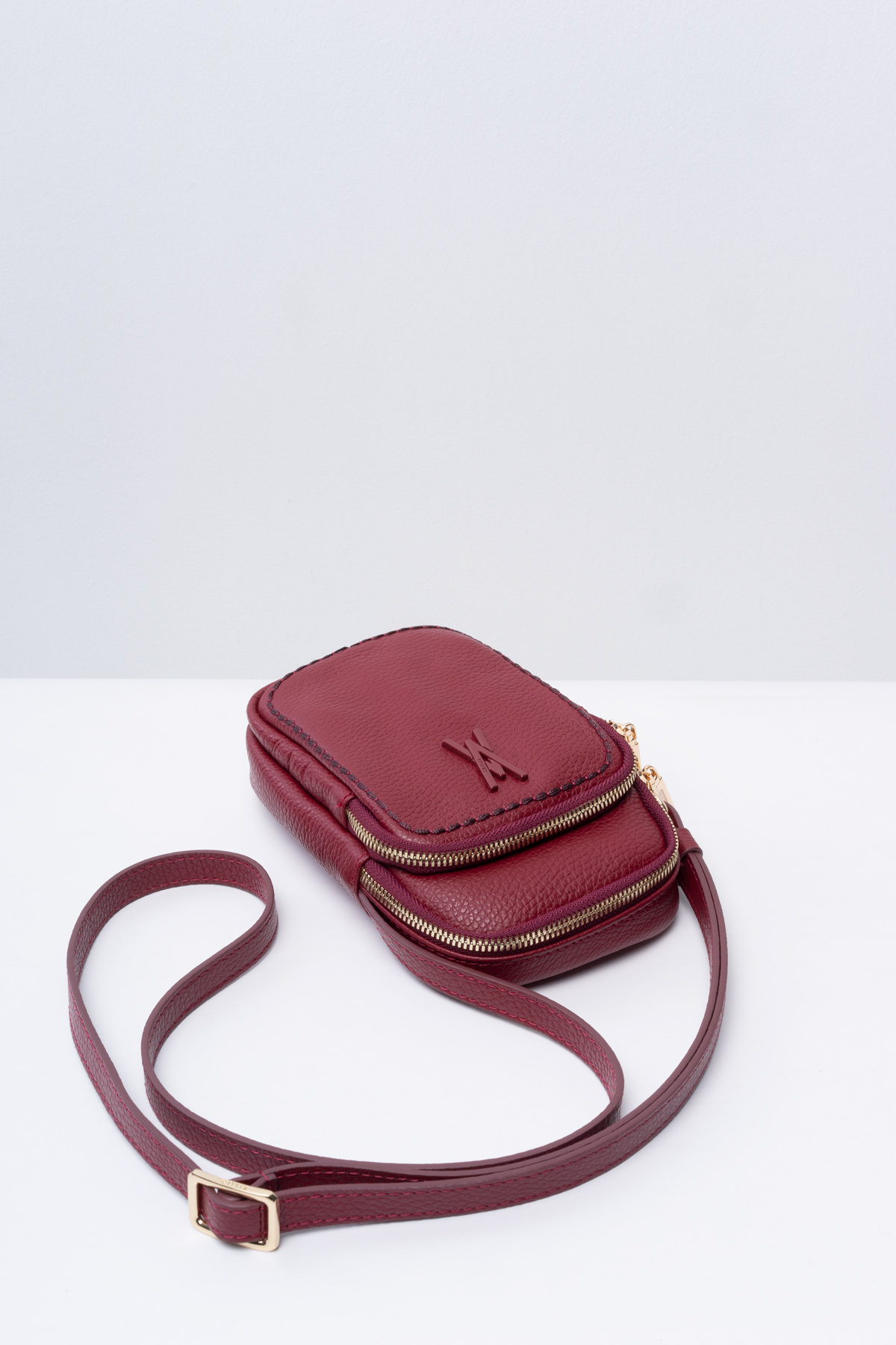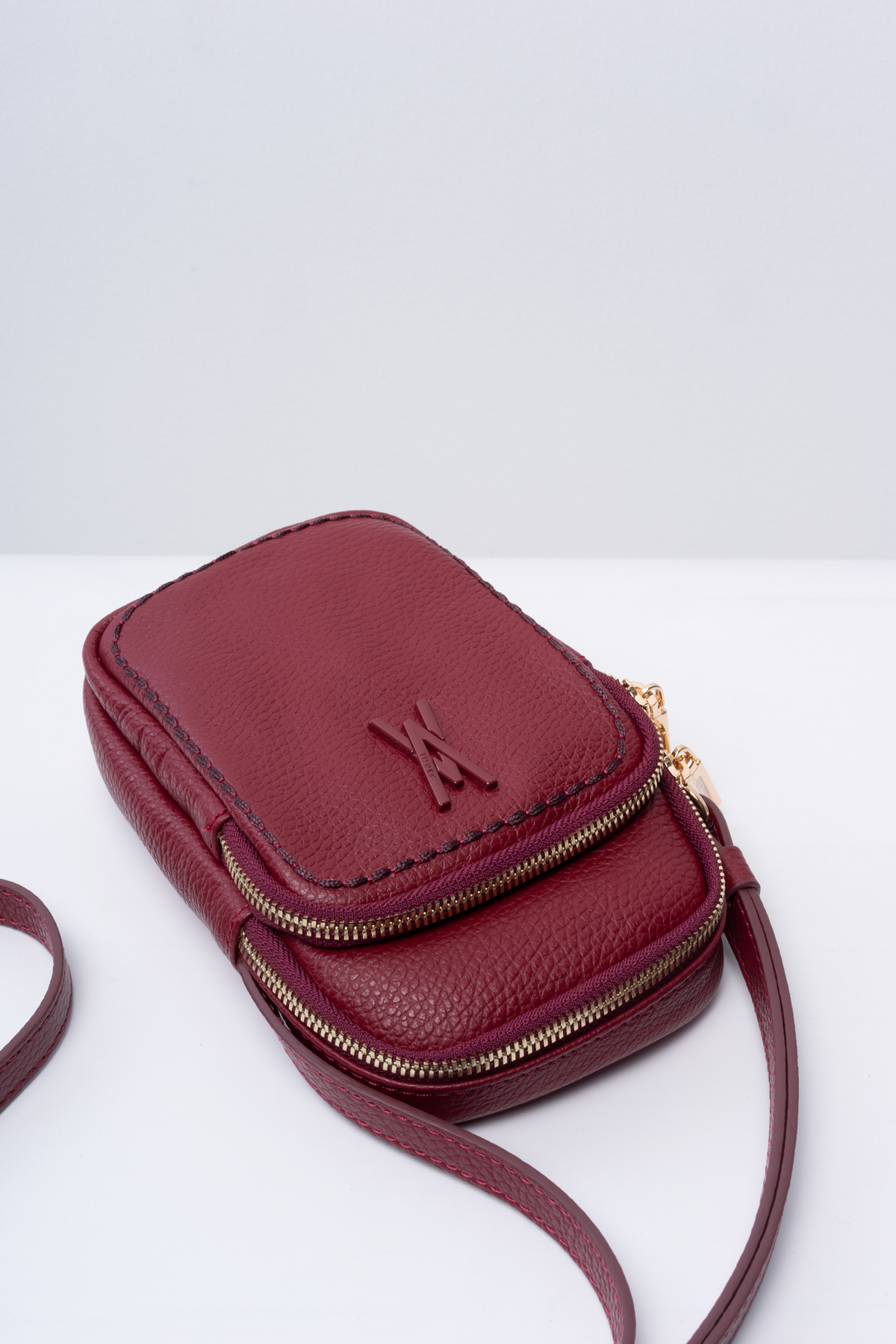 Вишневая мини-сумочка VISONA' как яркий акцент в ваших образах. Деликатный блеск натуральной гранулированной кожи, элегантнгая фурнитура "светлое золото" и компактная форма, которая вместит в себя все самое важное - телефон, документы, ключи и, конечно, губную помаду. Лаконичный логотип тон в тон - фирменный почерк бренда.