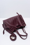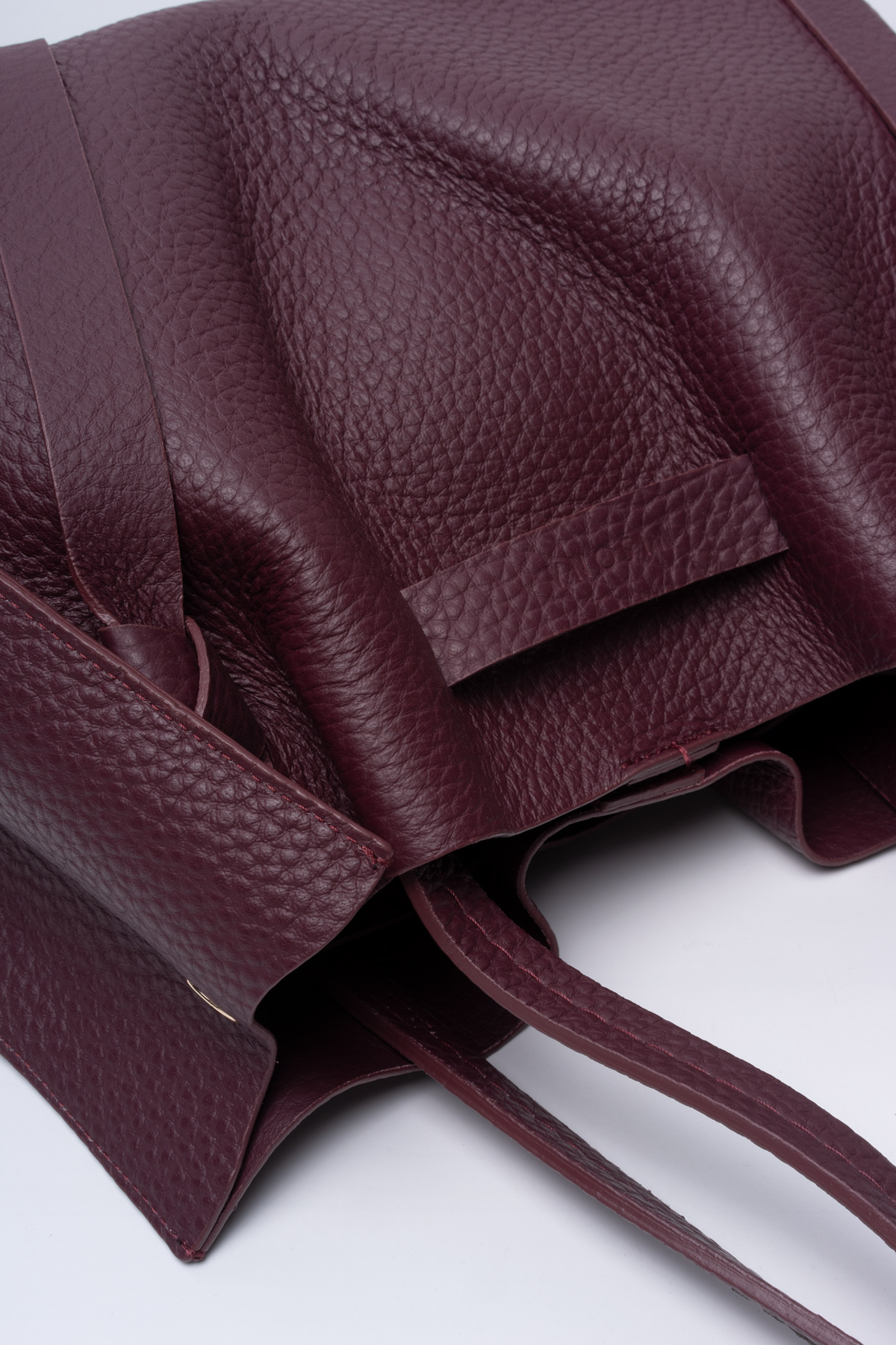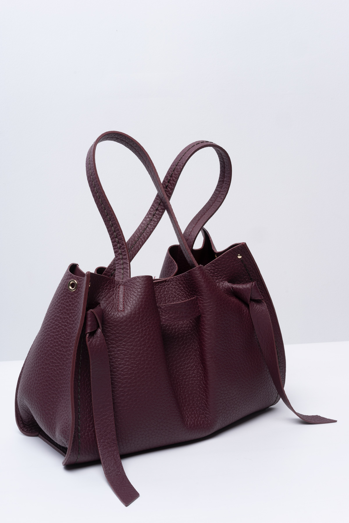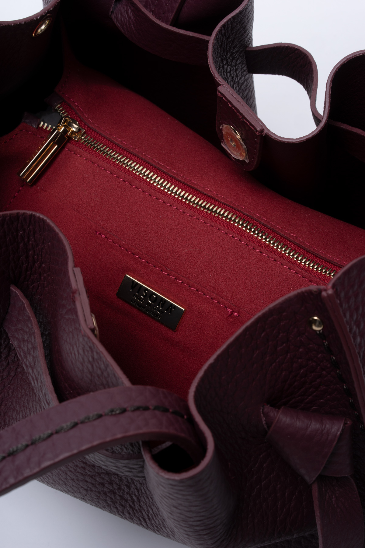 Матовый блеск отборной натуральной кожи крупнозернистой фактуры и глубокий оттенок "марсала" создают безупречную осеннюю гармонию. Изящный акцент создают декоративные узелки и светло-золотая фурнитура, а легкая драпировка отсылает к элегантным ретро-формам. Основное отделение в роковом алом цвете застегивается на молнию, по бокам два отделения быстрого доступа.