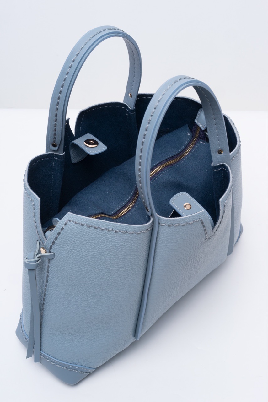 Небесно-голубая сумка-тоут как свежий, легкий и утонченный акцент вашей весны и лета. Он изготовлен из натуральной зернистой кожи высокой выделки - плотной, упругой и мягкой. Благодаря продуманной конструкции тоут держит форму - ему не грозят провисания или визуальная «усталость» материала. Фирменная строчка тон в тон деликатно подчеркивает оригинальный силуэт.